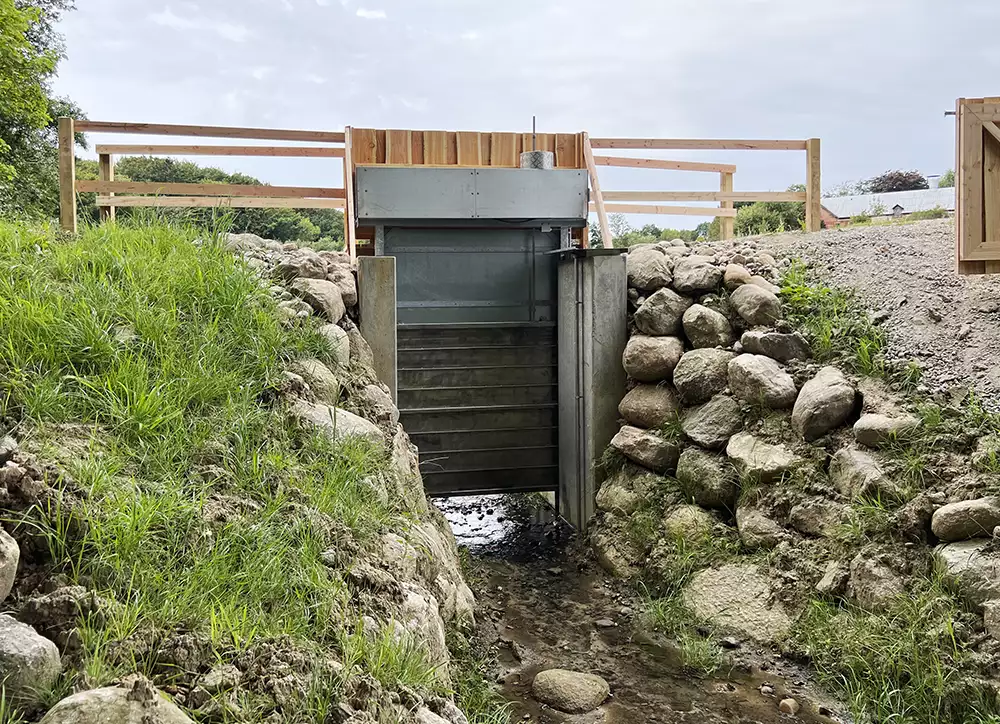 AquaBlokk® præfabrikeret sluse etableret i Grejsdalen Vejle Kommune har etableret et forsinkelsesbassin i Grejsdalen for at opstemme regnvand når der
